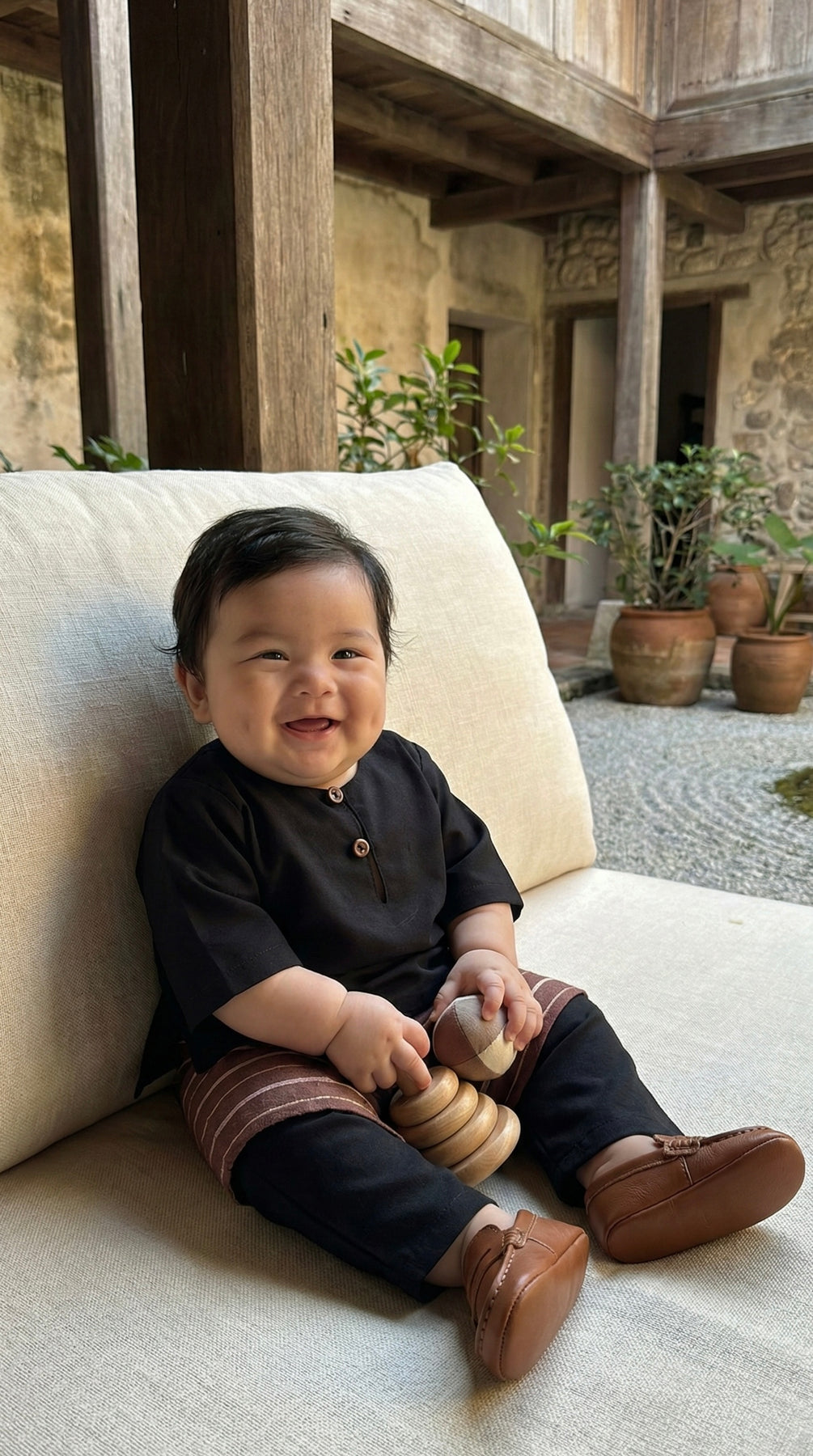 The QAID Baby’s Baju Melayu Teluk Belanga in Charcoal features a soft, relaxed silhouette that allows easy movement while maintaining a smart, classic appearance.