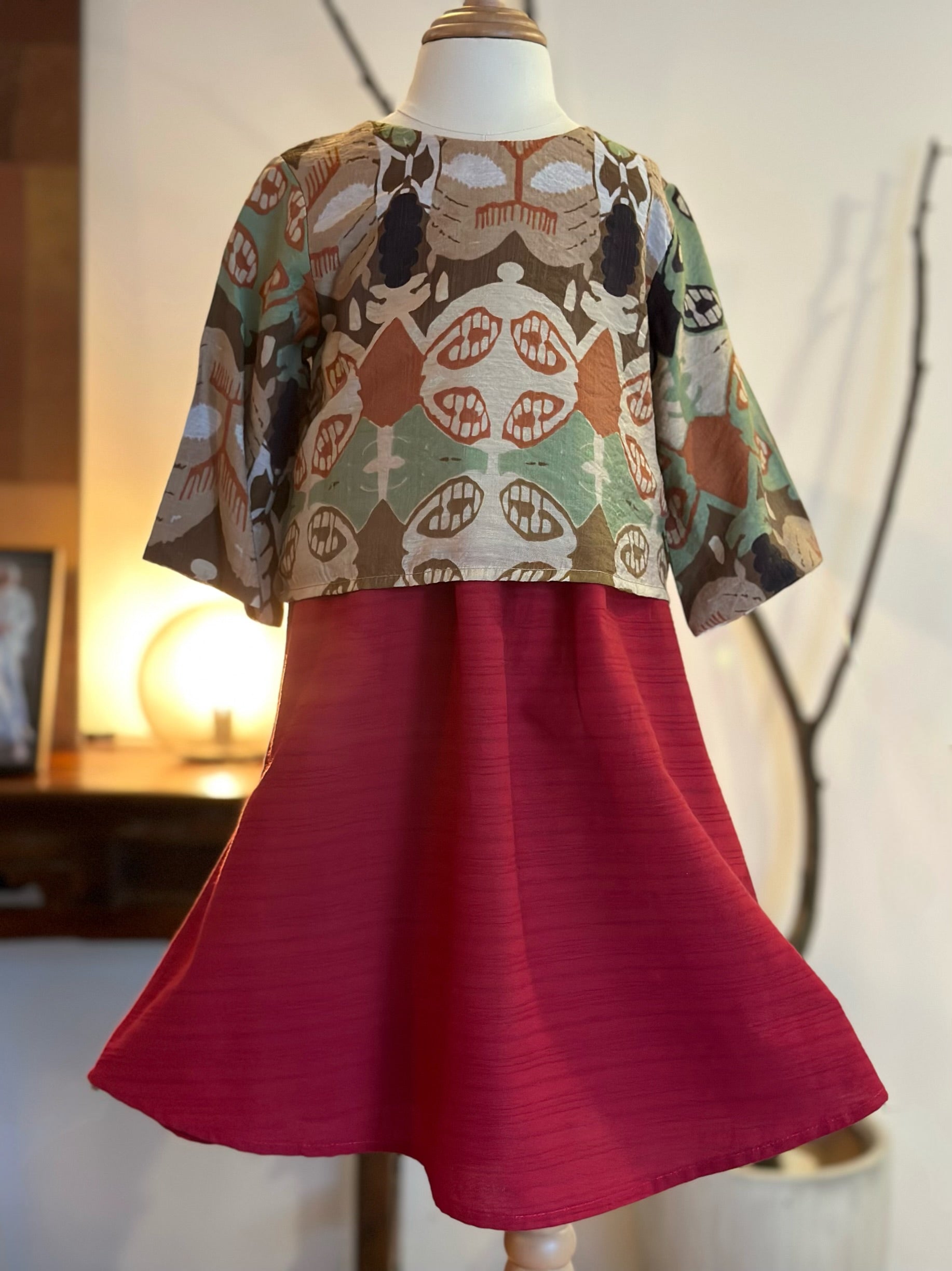 The top is crafted from a blend of luxurious cotton and rayon, adorned with a variety of exquisite multicolored prints. Its fully lined design adds an extra layer of comfort and style. The bottom features a 100% cotton fabric with embroidered stripes in a regal ruby red hue.