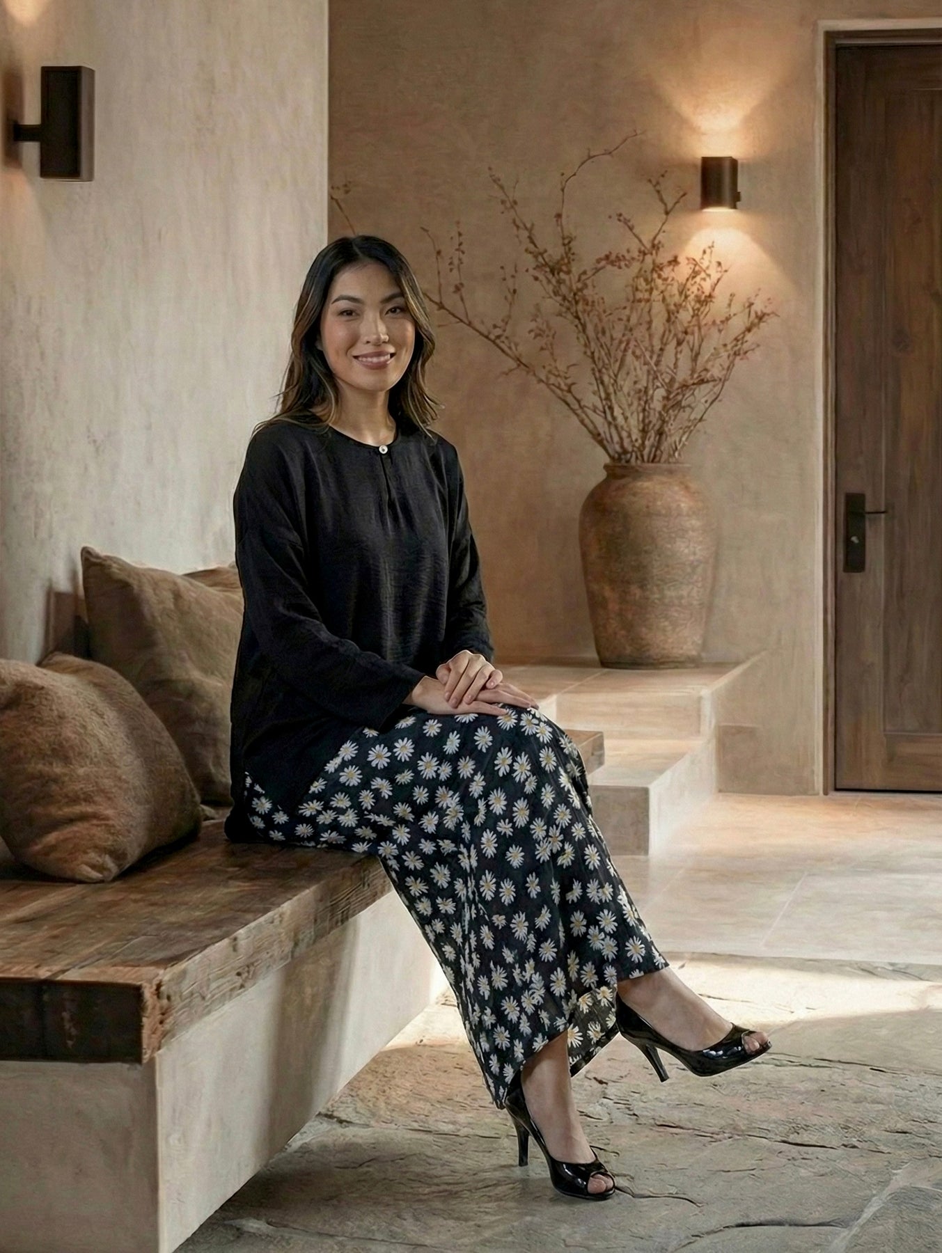 The luxurious MULUS Kurung Kedah Set in Ebony features a top crafted from soft, lustrous rayon in a glossy ebony black tone, adorned with exquisite mother of pearl buttons. To further soften the look, the bottom piece is completed with floral embroidery and daisy prints.