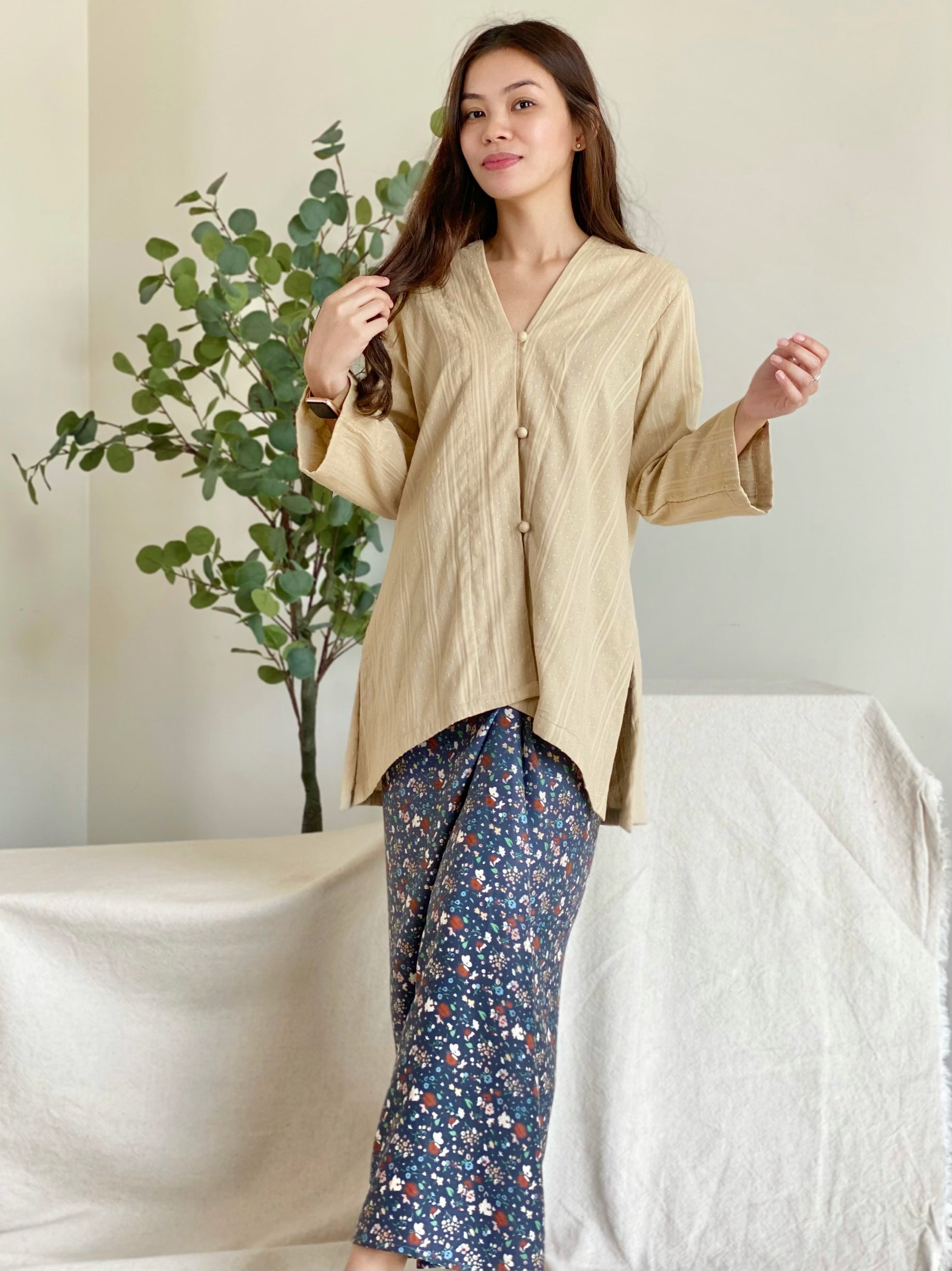Step into effortless grace with Laila, a refined ensemble designed for the woman who values both classy-style and comfort. The delicate airy kebaya with a subtle woven checkered pairs flawlessly with a flowing satin skirt in a dreamy pastel baby blue, creating a look that is both modest and captivating.