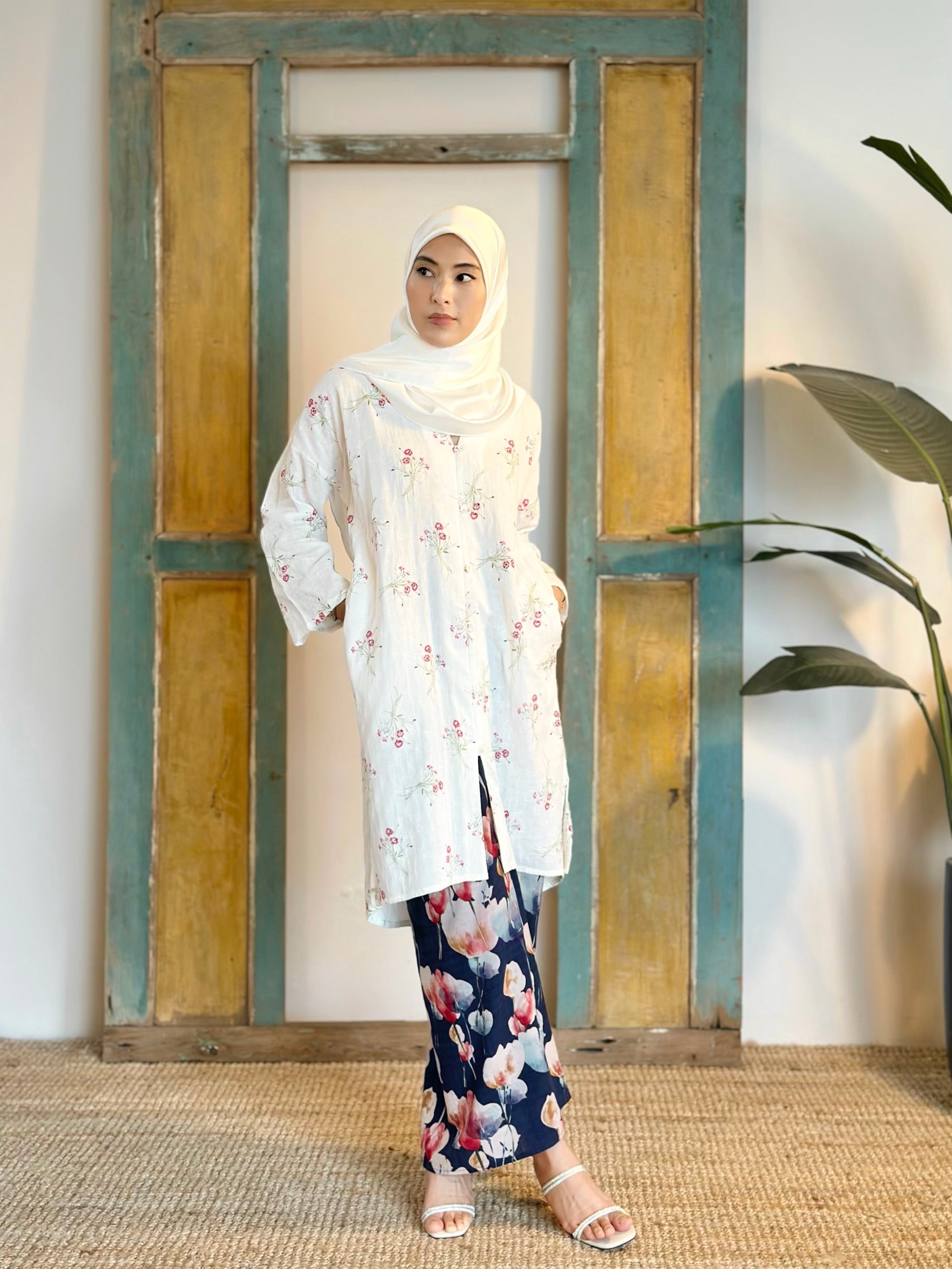 Luxuriously crafted with 100% cotton with intricate floral embroideries on a pristine white background, this exquisite set is simply beautiful. The pareo skirt is flowy and cooling with whimsical irregular polka prints. Adorned with mother of pearl buttons, this set is the epitome of traditional-wear grace.