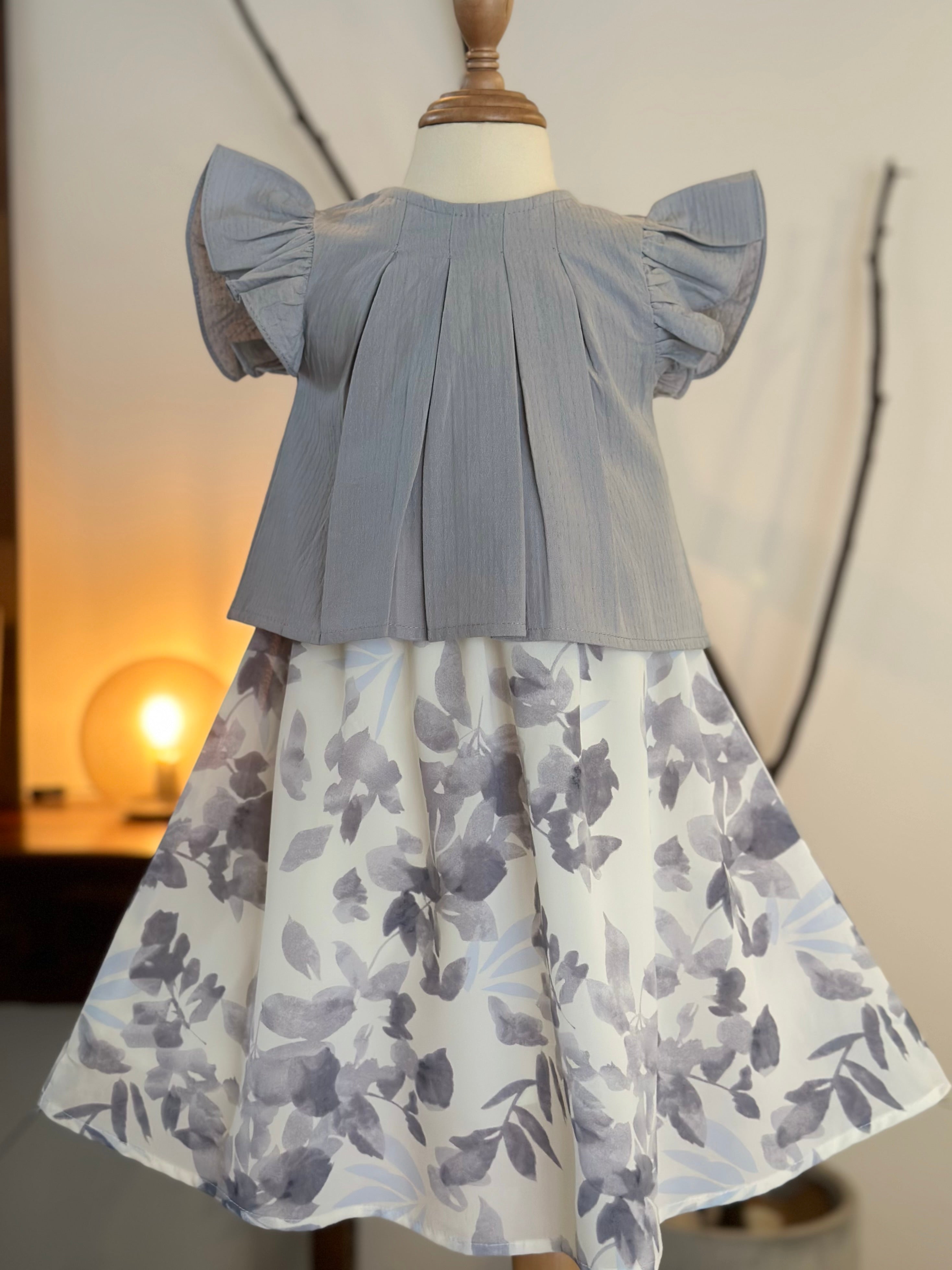 This set features a stylish top made of 100% cotton, delicately embroidered in an elegant ash grey color. It also includes a smooth satin bottom with grey floral prints on a white background, fully lined for added comfort and coverage. The top is complemented with real mother of pearl buttons for a touch of luxury.