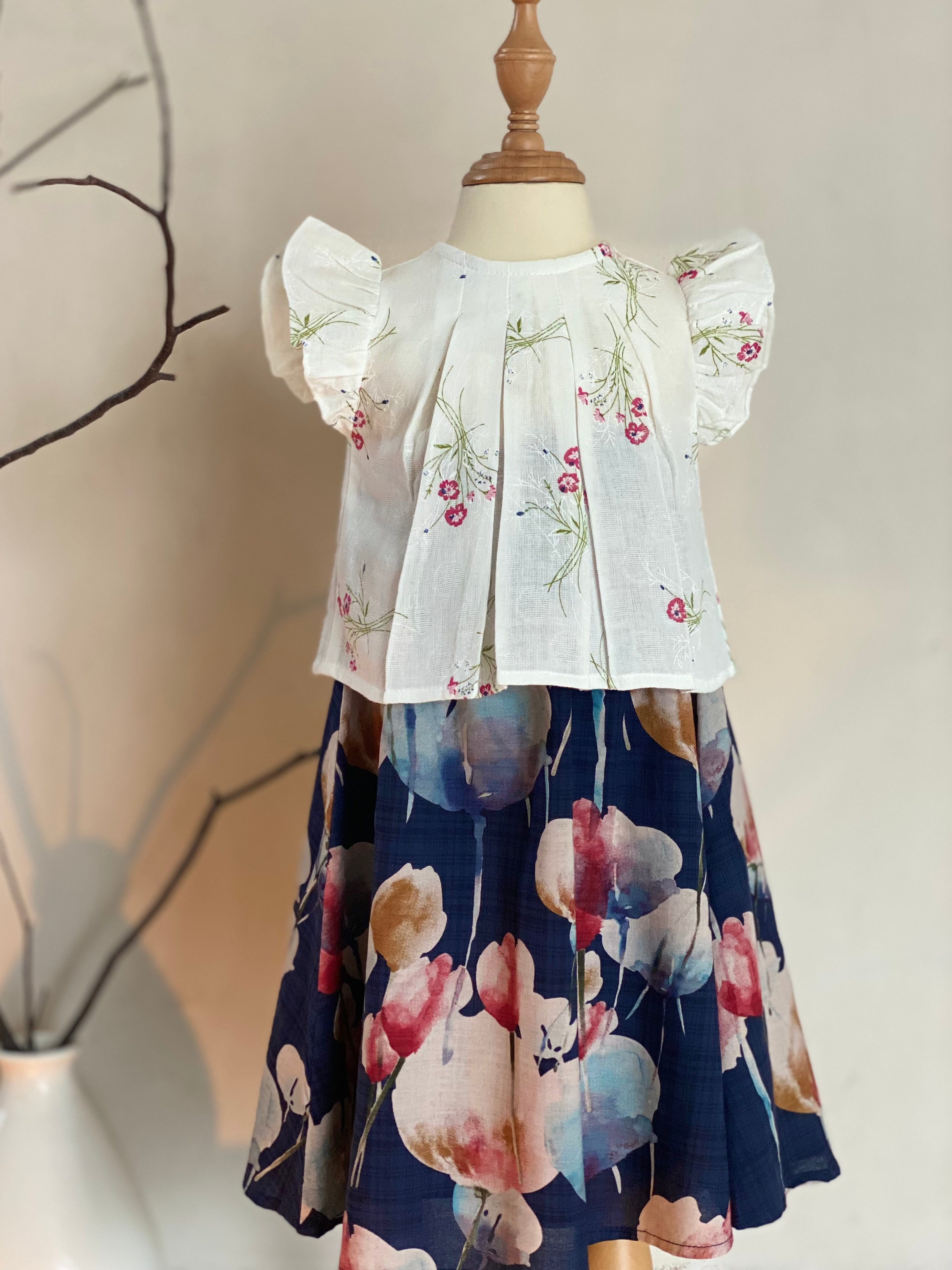 Crafted with lightweight  muslin-cotton featuring delicate floral bouquet prints on a crisp white background, the top adds a touch of elegance to this set. Paired with richly colored floral prints on a dark blue background, the 100% cotton bottom adds a pop of color and comfort.