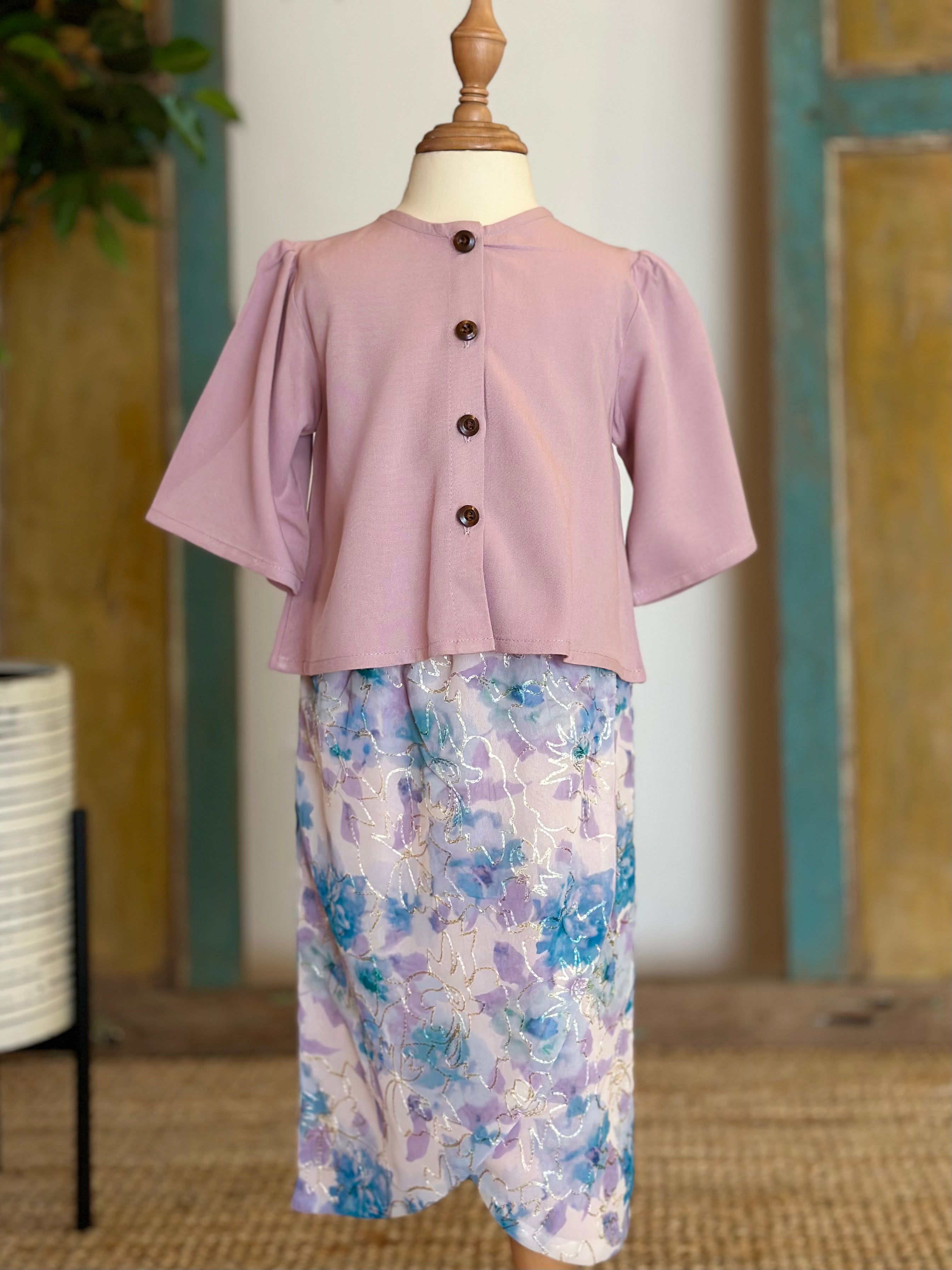 - Top: Soft cotton-rayon with mother of pearl button in dusty pinkish lilac