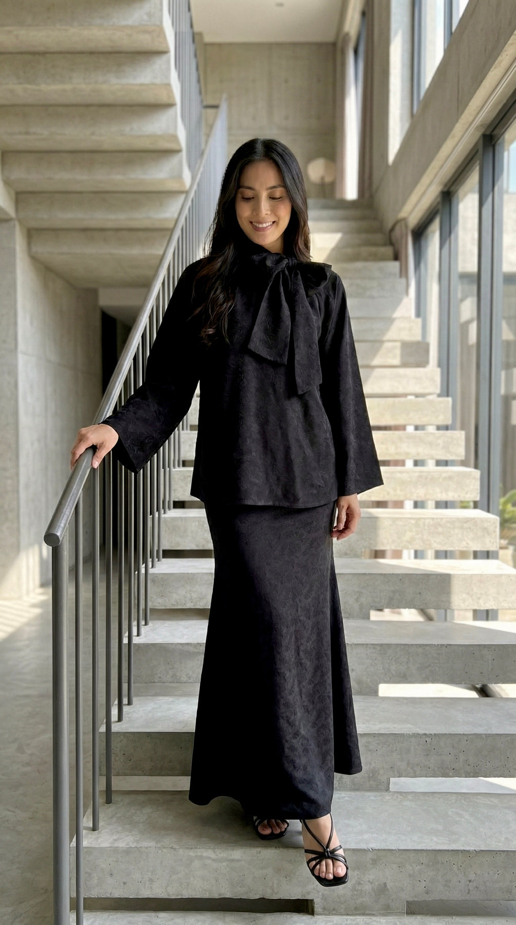 The JAMILA Bow tie Blouse and Skirt Set in Charcoal brings together gentle draping and thoughtful detailing, creating a look that feels polished, feminine, and effortlessly graceful.