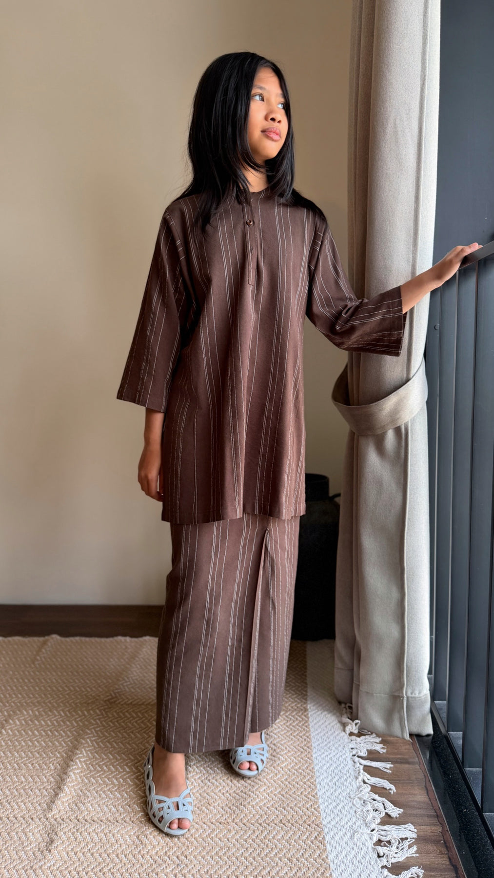 The DELIMA Kurung Riau Set in Brown Stripes combines simplicity with gentle patterning, creating a look that feels neat, composed, and suitable for formal occasions and family gatherings.