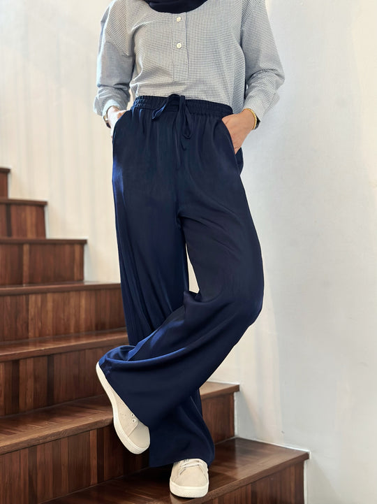 NAOMI features a full elastic waist with a drawstring, side and back pockets, and a full length wide-leg design. The flowy effect is complemented by the soft rayon material, which adds to the deep midnight blue color with a lustrous surface.
