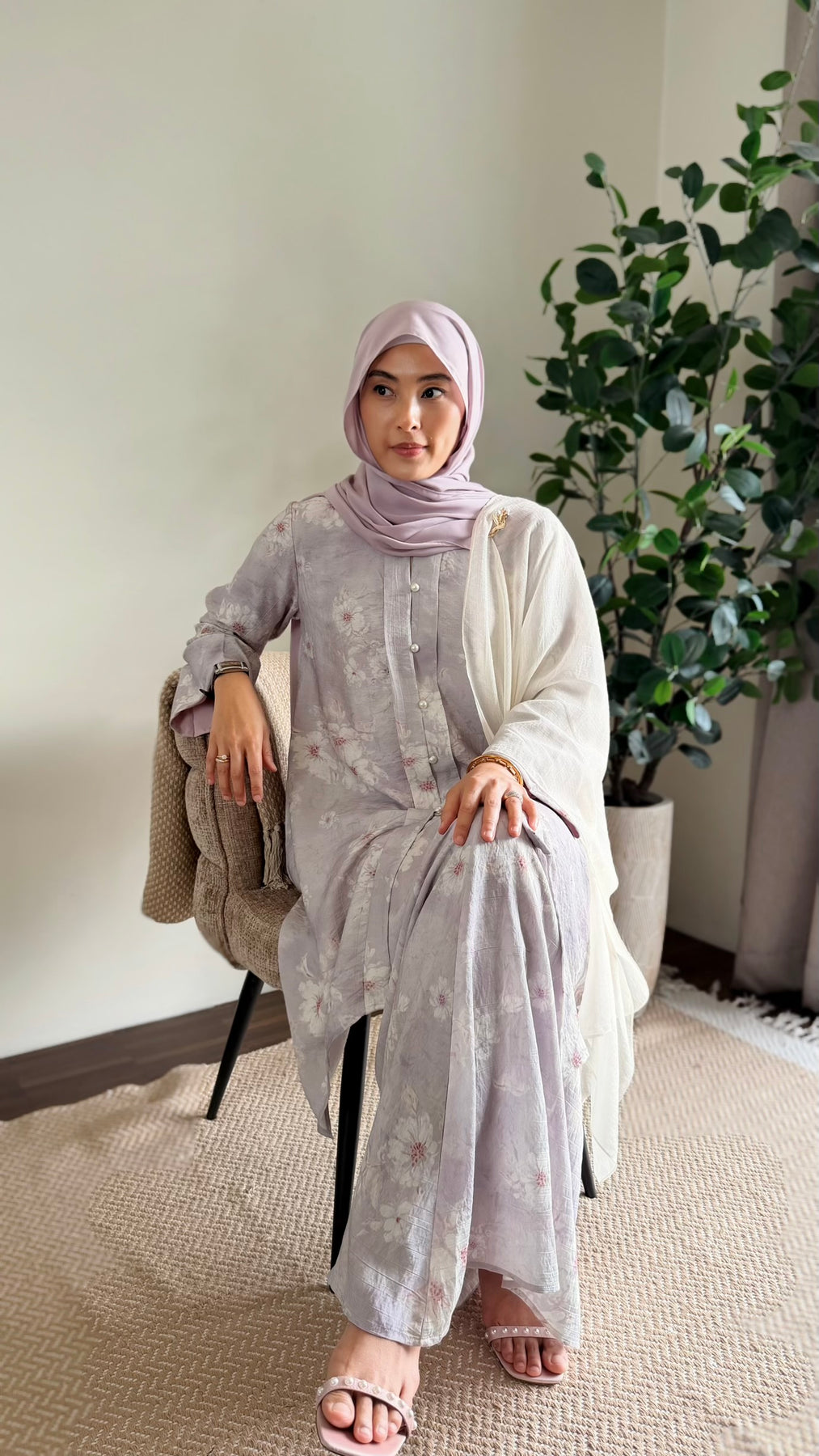 The RATU Long Kebaya Set in Misty Thistle combines a relaxed kebarung silhouette with delicate detailing, creating a look that feels feminine, airy, and effortlessly refined.